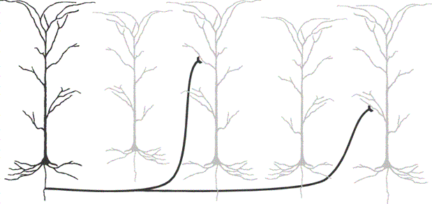 Are there brain circuits capable of running this sort of Darwinian process on the time scale of thought and action – say, milliseconds to minutes? Do they have enough of the speedup catalysts to operate so quickly? That was the topic of my 1996 book, The Cerebral Code, and the answer appears to be yes for the recurrent excitatory circuits of the superficial layers of neocortex. They have patterned connections rather like express trains that skip a lot of intermediate stops. This should allow them to make clones of the spatiotemporal firing patterns, the codes that are used to represent a concept. Concepts can compete for ascendancy by running a pattern-copying competition biased by a virtual environment of feelings, drives, and memories. This can be as Darwinian as the copying competition between the bluegrass and the crabgrass in my back yard – except that what competes are codes for concepts and plans of action. The circuits that seem capable of copying spatiotemporal firing patterns are found in most areas of neocortex, not just in the areas that might be involved in ballistic movement planning or language. But we still don’t know how much of the neocortex makes use of this ability and when. Once, during a period of fetal or infant tune up? All the time, in all areas of neocortex? Where and when await experimental evidence, and the more interesting question – how to make subroutines out of the successful plans, so as to avoid running slowly through the whole Darwinian copying competition on subsequent occasions – hasn’t been elucidated at all. But let us assume that some brain circuits are capable of running such a process for making multistage coherent plans, and judging them for quality against your memory of what’s reasonable and safe, biased by your emotions, drives, hopes, and fears. That gives us a prime candidate for the transition: the secondary use of ballistic movement planning circuits for the novel structured tasks of higher intellectual function.