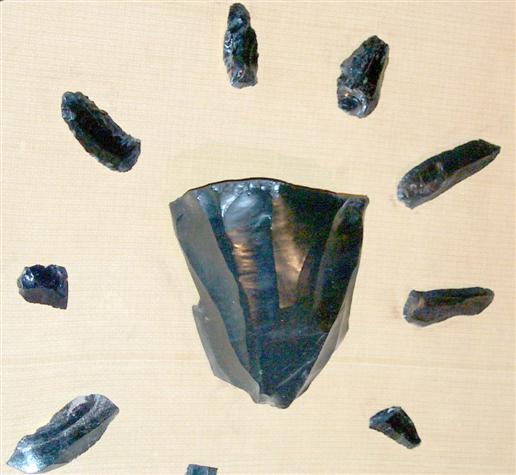 Obsidian core and blades, National Museum of Kenya, Nairobi Using a punch ensured that the pressure focused on a narrow edge. This technique allowed a thin blade to be sheared off – but it is not uniformly thick. Instead it often thins down to one sharp edge. It can be grasped in the manner that we would hold a single-edged razor blade. Or it can be mounted in a handle, perhaps held in a split stick. Because a whole series of thin blades could be sheared off from the prepared core, it was quite efficient in conserving raw material. Other things were changing in this period, but it is hard to tell because Homo sapiens population densities were so low in Africa. They were spread even thinner than historic hunter-gatherers. In southern Africa, they were eating eland, a large antelope adapted to dry country, quite regularly – but they were not often eating the more dangerous prey like pigs and cape buffalo, which can be quite aggressive toward hunters. They generally didn’t fish. They didn’t transport stone over long distances, even though making blades. When they buried their dead, there were no grave goods or evidences of ceremony. Campsites did begin to show some evidence of organization. So this isn’t just toolmaking. Anatomically modern Homo sapiens of Africa were not conspicuously successful like the behaviorally modern Africans that followed. They certainly didn’t leave much evidence for a life of the mind. Perhaps archaeologists will dig in the right place and change this view, but a half-century of testing the hypothesis – that the bloom in creativity came long after Homo sapiens was on the scene – has led to the view that mere anatomical modernity was not the big step. The archaeologist Richard Klein summarizes the data this way: