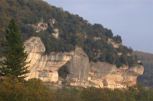 x Cliff overhanging modern buildings, Les Eyzies de Tayac, France