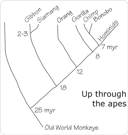 My origin story starts at 7 million years ago, so as to cover the time since we emerged from the great apes.  To understand the emergence of mind – and particularly the higher aspects of consciousness that so set us apart from the rest of the animal kingdom – we need to understand what the great apes are capable of.   And what they don’t do.  That will help us appreciate what happened in ape-to-human brain evolution since we last shared a common ancestor with the chimpanzees and bonobos of Africa.