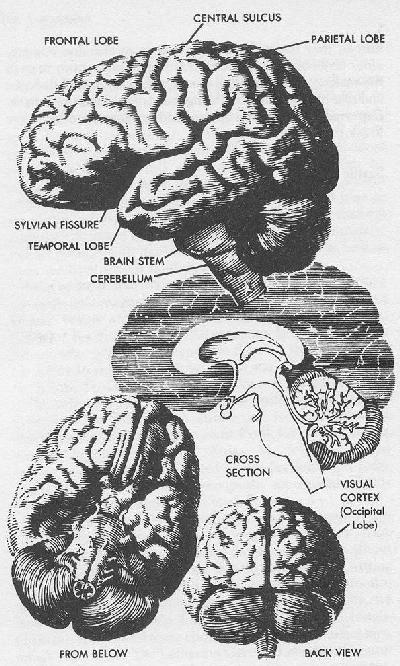 Different views of the human brain, by Anthony Ravielli (reproduced with permission from The Human Brain, Its Capacities and Functions, by Isaac Asimov [New York. Mentor Books, 1963]). |