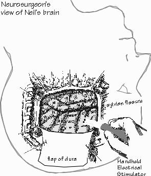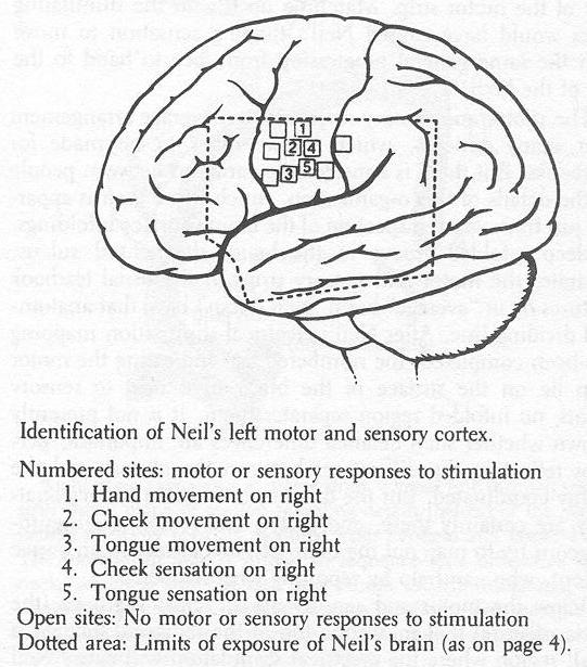 The neurosurgeon picks up a penlike device with two silver wires on its tip. Connected to an electrical stimulator, the device is controlled by an electrical engineer looking down from behind the windows of the gallery above the OR. When the two silver wires are touched gently to the surface of Neil's brain, several milliamperes of current flow through the brain, and then the wires are lifted off. "Hey, I felt something on my face," Neil says with some surprise. "Did your face move first?" "No, it just felt funny-- like tingling. "Well, let me try another spot." The neurosurgeon momentarily touches the wires to an adjacent part of the brain, slightly in front of the first spot. "My mouth moved!" The anesthesiologist, who has been watching Neil's face carefully, says, "It was just the right corner of his mouth. It pulled up for a second, and then relaxed." The neurosurgeon places a little piece of sterile paper, with a number printed on it, on the brain at the site where the mouth movement was evoked to mark the spot temporarily. The electrical stimulation is then applied to another site, farther away from the ear and closer to the top of the head. "Hey, my hand moved! Just like someone else moved it for me!" Which is, of course, exactly what has happened. The part of Neil's left brain touched by the stimulating wires is part of the brain essential for movement of his right hand. Neil uses it whenever he wants to move his right hand. The electricity applied by the neurosurgeon simply bypasses the voluntary control and directly initiates the hand movement.