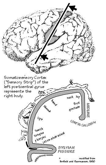 That the left side of the brain controls the right side of the body is something that was known even in the ancient civilizations. The great Greek physician Hippocrates observed that after injuries to one side of the head, it was often the opposite side of the body which became paralyzed or might be involved in a seizure. That there is a very orderly map in the left brain for movements of the right side was discovered only in the nineteenth century. Its details were described by a British neurologist, Hughlings Jackson. As the neurosurgeon moves the stimulating wires toward the top of the head, the sequence of face to hand will progress to chest and hips. More detailed "mapping" using this technique will reveal thumb and forefinger areas within the hand area. More space in the brain seems to be devoted to the fingers than to the leg. 2 Parallel to this "motor strip" controlling muscles is a strip where sensations are evoked. This "sensory strip" is just to the rear of the motor strip. Marching up it with the stimulating wires would have caused Neil's tingling sensation to move with the same general progression from face to hand to the rest of the body.