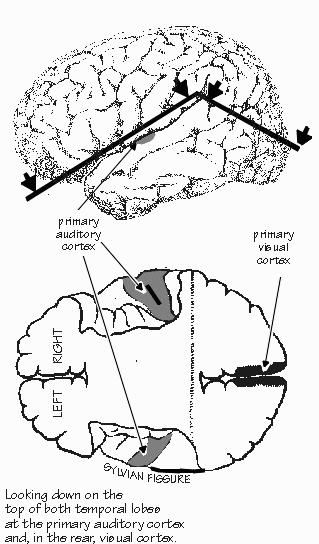 The motor and sensory strips have an average arrangement over many patients, which allows maps to be made for textbooks. But there is considerable variation between people in the details of this organization, much more than is apparent just from visual inspection of the brain's surface infoldings. A deep infolded groove in the brain, the central sulcus, separates the motor and sensory strips in the usual textbook pictures of an "average" brain. Neil doesn't have that anatomical dividing line. After Neil's electrical-stimulation mapping has been completed, the numbered tags indicating the motor strip lie on the surface of the brain right next to sensory points; no infolded region separates them. It is not presently known whether such detailed differences are important, perhaps reflecting the differences between the clumsy and the highly coordinated. But the differences in brain surface anatomy are certainly there, and that is one reason why neurosurgeons try to map out the brain physiologically in an awake patient, who can help by reporting what happens. Below the motor and sensory areas, across a groove (the sylvian fissure) that marks the top of the temporal lobe, is a small region where the electrical stimulation will cause Neil to report buzzing noises: the auditory receiving area. If the left visual cortex located in the back of Neil's brain were to be simulated, he would report flashes of light. Those light flashes would appear in the right side of Neil's vision, for like motor function, vision is wired up in a crossed fashion so that everything we see to the right of our center of vision goes to the left brain. Since the surgery today does not require the back of Neil's brain to be exposed, this cannot be done in Neil but it is well known from studying other patients.