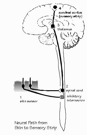 The screen goes blank after Neil finishes with the last slide. Immediately, everyone in the OR moves around a little and the noise level rises, as all had been quiet during the performance and recording. "Very nice, Neil. Want to move around a little?" asks the neurosurgeon. "Aagh! My leg fell asleep. Now my toes are tingling. Is that important? I wouldn't mention it, but you told me to tell you if I felt something," says Neil. "Sounds familiar. That happens to nerves when they get blocked by pressure. No problem as long as they're tingling and not numb. The anesthesiologist will check out things. just move around a little." There is a chain of neurons which links the skin with the sensory strip of Neil's cerebral cortex. First is the transducer neuron in the skin, which senses pressure, the movement of a hair, or temperature. Next comes the "second-order" neuron, across the synapse in the spinal cord or in the brain stem. The third neuron in the chain is often in the thalamus. The axons from the thalamus go up to the sensory strip of cerebral cortex, so that there arc at least three neurons in the chain before a cortical cell gets a chance. The direct four-neuron chain is not, however, the only path. As we have seen, there may be a relay in the brain stem's reticular activating system. Some axon branches go up to the cerebellum, the elaborate infolded structure which sits atop the brain stem and assists in the coordination of movements and posture. It too talks to the sensory strip. Each of the senses has a similar set of direct and indirect pathways from the transducers to the cerebral cortex.