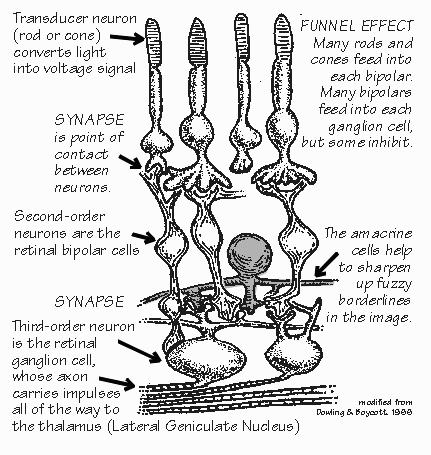 Particularly in the case of vision, neurophysiologists have been able to partially understand what happens at each successive neuron in the chain. The transducer neurons are the rods and cones of the retina. The second and third neurons of the chain are also in the retina. The axon of the third neuron, called the retinal ganglion cell, runs all the way from the eye to the thalamus. The axon of the fourth neuron runs from the thalamus up to the visual cortex in the back of the brain, The first neuron, the rod or cone, is very small: it responds only to light shining directly upon it. Diffuse light is one easy way to stimulate a single rod or cone; if a small spot of light is used (such as when looking at a star), it must be centered directly upon the particular transducer cell. So the image of the visual world projected upside-down on the back of the eye is changed- into the voltages of a mosaic of transducer neurons. The second and third neurons in the chain start the process of comparing neighboring regions. A particular neuron responds best to a small spot of light, covering a number of adjacent rods and cones. If the light spot moves, the positive voltage changes into a negative one. If one moves the spot even farther away, the voltage becomes very small. So there is a doughnut-shaped map: the transducers in the center cause excitation, those in the surrounding ring cause inhibition.. What happens if both areas are illuminated, as happens with diffuse light? The positive and negative influences cancel - sometimes totally, as if the light were not there at all, sometimes only partially.