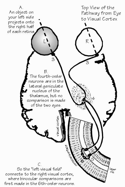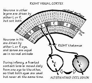The two eyes see slightly different views of the world, as the reader can appreciate by alternately closing one eye and then the other, while reading this page. The "rangefinder" effect is quite useful for judging distances, at least out to 7 about five meters away (the length of an automobile). Not until the sixth-order nerve cell is the information from the left and right eyes combined, at least in primate visual cortex. At lower levels of the visual system, a cell either responds to light shown in the left eye, or to light shown in the right eye. In the cortex, there are cells responsive to both eyes. The visual cortex is wired up from birth with this ability, but it can be lost if the infant does not get a chance to use both eyes together. An infant monkey with a frosted contact lens, switched daily from one eye to the other, gets visual experience with each eye but the two eyes never get a chance to work together. The cells which would ordinarily respond to both eyes now seem to specialize in one eye or the other. Even if the contact lens is discarded and the monkey is then given normal visual experience for a long time with,both eyes together, the situation tends not to reverse: there will be very few coordinating nerve cells, permanently. There seems to be a critical period in infancy (in monkeys, about the first nine months after birth) during which experience with the environment can make permanent wiring changes, at least such obvious ones as these.