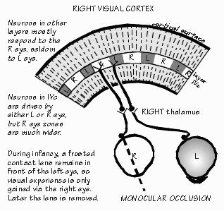 Such research, of course, has many implications for our own infants. Babies born cross-eyed have a problem similar to that of the infant monkey just noted; the two eyes never get a chance to work together. Rather than seeing double, humans with a squint will tend to suppress permanently the vision in one eye, becoming functionally blind in that eye (monkeys, interestingly, do not have this problem if made artificially cross-eyed; they can switch back and forth from one eye to the other). Such animal research has emphasized the need to correct cross-eyed conditions in infants as soon as practical; the relevant critical period in humans is probably the first two years after birth. There are also indications that there are critical periods for other brain systems besides the visual system. The timing of each system's critical periods is often different. Indeed, there is a hint that such critical periods may exist for human language. The existence of critical periods for normal brain development blurs the distinction between environment and heredity: now, early environment as well as heredity determines the brain machinery that is available for later interactions with the environment. As David Hubel noted, "Perhaps the most exciting possibility for the future is the extension of this type of work to other systems besides sensory. Experimental psychologists and psychiatrists both emphasize the importance of early experience on subsequent behavior patterns--could it be that deprivation of social contacts or the existence of other abnormal emotional situations early in life may lead to a deterioration or distortion of connections in some yet unexplored parts of the brain?" The current thinking among researchers is that during the critical period, there is competition among nerve cells in the visual cortex, a variation upon the survival of the fittest. If the frosted contact lens is left on one eye for a while during the first six months of life, the usual 50-50 representation of left and right eyes will change in the narrow band in layer IVc of the visual cortex where the fifth-order cells arc located. Fifth-order cells normally specialize in either left eye or right eye, never both. Normally, there is a territory about 0.4 mm wide containing only cells representing the left eye, then a 0.4 mm territory for the right eye, alternating left-right-left-right every 0.4 mm across the visual cortex. In the infant monkey with badly blurred vision in one eye from the frosted contact lens, the territories from the "bad" eye shrink and those for the good eye expand as if the active "exercised" cells had won a competition for space in the brain.