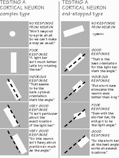 There is even a problem with animals growing up in vertically striped environments: some researchers report that .the orientation preference of the cells may shift, producing a higher than normal proportion of cells specializing in vertical orientations. As with other effects summarized above, there' is now a new round of scientific literature, pointing out the exceptions and variations and occasionally reporting failures to reproduce other researchers' results. (One famous failure to reproduce others' findings from cat visual cortex turned out to be due to slightly different breeds of Siamese cats in Massachusetts and Wisconsin; that discovery in turn has opened up new opportunities to study the wiring accidents during prenatal development from which these cats suffer). Thus a picture emerges of how the cells are wired together, how their internal electrical processing of information is carried out, where they send their new messages, and what happens next. |