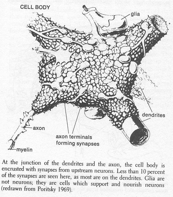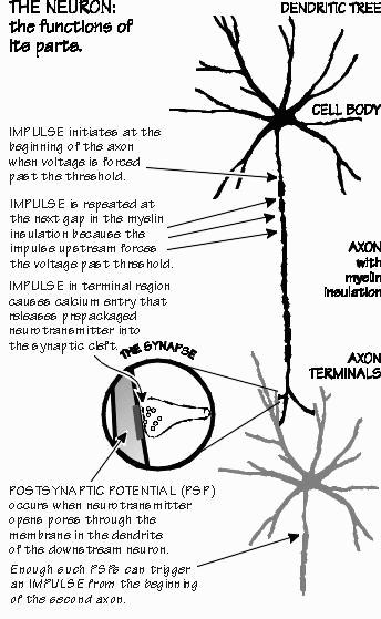 About this time in midmorning, the electronics technicians get very busy and several more doctors appear. Rather than coming scrubbed into the OR, the doctors wander into the glassed-in gallery upstairs, which looks down into the OR. They are neurologists who specialize in the interpretation of the electroencephalogram, more commonly called EEG or "brain waves." They first analyzed Neil's brain waves months ago by recording minute electrical voltages from sixteen places on the skin of Neil's head. Epileptic seizures are often preceded by, abnormal EEG voltage patterns; indeed, there are often abnormal EEG patterns in epileptics even when a seizure is not imminent. For the muscles to start jerking, the abnormal electrical activity must involve wide areas of the brain. In many epileptics, seizures originate from only a small region and then disrupt the surrounding brain, which is otherwise trying to go about its normal business. Locating this "epileptic focus" is the big problem. In Neil's case, the scalp EEG suggested that this epileptic focus was in the left temporal lobe, which is in front of the left ear and below the motor and sensory strips. Since that portion of the brain can often be removed with little obvious effect upon a patient, Neil is willing to trade a potential deficit for the chance that his seizures can be brought under control. Had his epileptic focus been in the middle of the motor strip, it would have posed a dilemma: removing the left motor strip would have produced permanent paralysis of the right side of the body. Better seizures than paralysis. The neurosurgeon gently places the tips of eight silver wires on the surface of the brain and hooks the wires up to a cable leading to the EEG machine in the gallery. A TV camera above the EEG machine is connected to the TV screen downstairs in the OR, so that the neurosurgeon can see the results too. These recordings from the surface of the brain are much more accurate than the EEG obtained earlier from the skin, where the voltages had to travel through the dura, the bone, some muscle, and then the scalp. The EEG voltages are a product of the electrical signals from millions of nerve cells, mostly from those near- the surface of the brain. The EEG is an indirect indicator of their overall levels of activity, about the way that one could judge the overall daily activity patterns of the inhabitants of a~city by listening to traffic noises. What, however is the individual nerve cell doing with electricity? Nerve cells have two major tasks: computing, and then speeding the results of the computation to the far end of the nerve cell so that they can be passed on to another nerve cell. Both tasks run on electricity. The individual nerve cells (also called neurons) are shaped like leafless trees, with branches and roots separated by a long trunk. Sometimes the trunk, called the axon in a nerve cell, is only one millimeter long. Some neurons have an axon so long that it can reach from the tip of the toe to the base of the brain. An electrical signal speeding along this axon tells the brain that something has touched the big toe. This electrical signal is called the impulse. It is only 1/10 of a volt (more than a thousand times smaller than household electricity), it lasts only 1/1000 of a second (quicker than most camera shutters), and it races along the axon at speeds as high as 500 kph (300 mph).