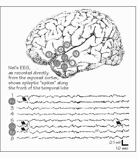 But this chemically evoked voltage change in the downstream cell does not usually cause an impulse by itself The second neuron in the chain from transaucer to brain is typically located in the spinal cord. There are hundreds of transducers in the skin and muscle converging upon this cell in the spinal cord, plus thousands of inputs from other neurons in- the brain and spinal cord. Some produce negative voltage changes ("inhibition"), others produce positive changes ("excitation"). As in a checkbook, the balance is what counts. If the voltage balance is big enough in the positive direction, another impulse will be triggered and will speed along the axon of the second nerve cell, often heading up toward the brain. The balance also determines the rate at which impulses can be produced, which varies between 0 and 1,300 impulses each second. Each nerve cell is thus a simple computer, adding and subtracting influences from many inputs, sending its new message on to many other cells. Chemicals are very important in producing the electricity, just as chemical reactions in batteries may be said to run a pocket calculator or a wrist ,watch. Chemicals also may slowly change the strength of the connection between two nerve cells. But it is with electricity that nerve cells add and subtract, and by using electricity that they speed their messages along to the next nerve cell. The EEG and "evoked potentials" are noisy by-products of all this .electrical processing of information, but clinically useful ones.' The EEG is not, however, an average of the electrical activities of the brain beneath the electrode. The closer that the neurons are to the electrode, the bigger their contribution. The cerebral cortex is only a few millimeters thick (less than two typewriter spaces). It may be divided into layers (usually six, numbered I-VI but sometimes subdivided even further, e.g., layer IVc). The largest neurons of the cortex are often found in the deeper layers, such as layer V. The inputs to the cortex often prefer certain layers, e.g., the messages from the eyes arrive only in layer IVc of visual cortex. The most poorly understood layers are the ones closest to the brain's surface (I, II, and III), and they are the ones which contribute most heavily to the EEG. Yet despite the lack of detailed understanding about the origins of the EEG in terms of the activities of neurons, a practiced eye can recognize normal and abnormal patterns in the electrical fluctuations of the EEG. Such empirical knowledge is essential to the analysis of where Neil's epilepsy originates. |