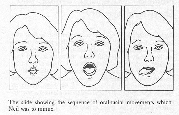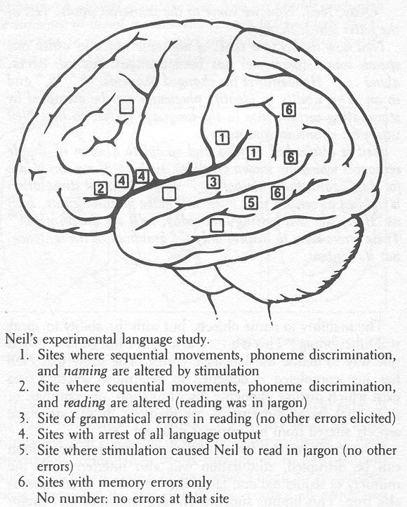 Stroke victims have taught science a great deal: by their own descriptions of their difficulties and from their patient cooperation with neurologists, a rough picture of cortical function has been built up over the years. Epileptic seizures have provided another way of guessing at the function of a particular portion of the cortex, but electrical stimulation of the exposed cortical surface gives more precise localization than strokes or seizures. The exposure of the brain during an epilepsy operation under local anesthesia provides a rare opportunity to explore the organization of the human language cortex, and Neil has agreed to help out. The "slide show" that was used to define the language portion of the cerebral cortex for the neurosurgeon is now finished. A new tray of slides for the research study is loaded into the projector. A TV camera positioned to watch Neil's face will record the action on videotape for later analysis. "Neil, we're all set to try those slides where you have to stick out your tongue. All comfortable?" asks the neurosurgeon. "Sure. I never thought that I'd be on television, sticking out my tongue." Neil's task, which he rehearsed the night before, is seemingly trivial. Each slide shows drawings of three faces: for example, a face with lips in a kissing position, followed by a face with the tongue sticking out straight, then to the right. Neil is to mimic the three faces in sequence, so he puckers up his lips and then sticks out his tongue straight and then off to the right. The next slide shows further instructions in the form of three more faces. As with the language testing, electrical stimulation is sometimes applied, sometimes not. When the stimulation is applied at certain sites, Neil has trouble producing the sequence of facial movements. A map is thus made of the various sites in Neil's brain where sequential oral-facial movements are disrupted by stimulation.