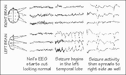Neil is moving around restlessly, not an uncommon problem after four hours on the operating table, but the anesthesiologist reports that Neil is making fumbling movements with both hands. "Neil, how are you feeling?" asks the neurosurgeon. "Feel funny. . . . I see that man walking his dog again. . . . He's getting bigger, and he's almost to the middle." "Neil? What's happening now?" There is no response from Neil. The fumbling movements of his hands become more pronounced, and he tries to move around but is restrained by the anesthesiologist and the circulating nurse. After a minute, Neil quiets down but still does not respond to questions. The neurosurgeon takes the opportunity to describe what is happening to those medical students watching from the gallery. "What you just saw was one of Neil's typical seizures. He often has this hallucination, the man walking his dog. That's the 'aura' which heralds his seizures. He knows that when the man and dog reach the middle of the picture, he is going to lose consciousness and not remember anything afterward. It's called a psychomotor seizure, and it only occasionally progresses to become the typical major motor seizure, with all of the rhythmic twitching of arms and legs." "Neil, can you hear me?" the neurosurgeon asks repeatedly for several minutes. "Wha . . . What'd you say?" "Neil, tell me what happened." "Don't know . . . guess I had a seizure, didn't I." "Did you hear me talking about you just now?" "Don't remember." "Do you remember seeing slides that you named for me?" "Yes, I think so. . . ." "When was that, Neil?" "You brought that slide projector to my room last night, I remember now." "What have we been doing this morning, Neil?" "You gave me those shots with the hypodermic needle. . . . And then, I remember now, you showed me those slides again," "Did you see anything unusual, Neil?" "That's right, I saw that man walking his dog again. He got all of the way to the middle of the picture this time, I remember him getting all of the way to the middle." "All right, Neil. You did have one of your little seizures. Everything is going fine, so just rest for a while."