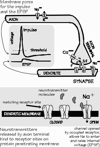 There are a number of steps in the process which one neuron uses to talk with another, a process called synaptic transmission. An electrical impulse in the first neuron travels down to the end of the axon, where there are regions specialized for releasing neurotransmitter molecules from the cell. A certain number of molecules are released by each impulse; the release process is triggered by calcium entering the cell following the voltage change of the impulse. The molecules start diffusing away from the cell membrane after their release, but the next neuron is just a short distance away, across what is called -the synaptic cleft. The surface of the next neuron at the synapse is quite specialized for detecting the neurotransmitter molecules. There are a number of sites called receptors, where a chemical bond can be formed between the neurotransmitter molecule and the receptor molecule. The combination molecule then unlocks the membrane of the second neuron to allow certain substances through, such as sodium, potassium, or chloride ions. These ions, in turn, change the voltage of the second neuron. So the first cell releases "keys," the second cell has a number of "keyholes," and a key which fits the lock opens a "gate." There are also mechanisms in the synaptic cleft for cleaning up neurotransmitter molecules. Rather like a vacuum cleaner for keys, these "Inactivation" mechanisms prevent some of the transmitter molecules from ever reaching the keyholes I'll the first place-indeed, they "suck the keys" back out of the "keyholes" after a short time, which results in the gates locking again to stop admitting chemicals to the second neuron. This is one way in which the effect of the impulse is limited in time: an impulse may last one millisecond itself, but its effect upon the second neuron via the neurotransmitter it releases may either be brief or long-lasting. At one time, it was thought that in schizophrenia, neurons released too many dopamine molecules each time an impulse arrived at a synapse. However, the supporting evidence for that idea has been mixed. Autopsy study of the brains of some schizophrenics suggests that there are many more receptors for dopamine in the striatum than in the same brain area of normal people. There thus may be an excess of "keyholes," rather than more "keys." And since the usual situation is to have more neurotransmitter available than receptors (more keys than keyholes), the presence of more receptors means that each impulse has a greater effect on the next neuron. In other diseases, too little neurotransmitter is produced: there are too few "keys," as in the shortage of dopamine in Parkinson's disease. In still other diseases, there may be too few keyholes. Apparently this happens in myasthenia gravis, in which the body's immune mechanism runs amok and destroys 80 percent of the receptor sites ' at the nerve-muscle synapse. There are problerns when the cleanup process fails, so that neurotransmitters stay around too long. Some poisons work this way, such as nerve gases and the pesticides. Other poisons such as curare act as if they were keys which fit the lock but don't turn, their presence in the keyhole keeping the right keys from entering the lock.' Many drugs more gently affect the synapse by changing the number of keys, by partially occupying keyholes, or by slowing the cleanup. In one way or another, the effect of the impulse is being modulated to alter the strength of the functional connection between the two neurons. From such synaptic alterations come the hallucinations of LSD and the therapeutic actions of levodopa. What drugs modify the synapses in the memory or selective-attention pathways? No one knows. |