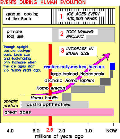 And we now know that about 2.5 million years ago, three major trends started up, all at about the same time: prolific toolmaking, brain enlargement, and the ice ages. Was one the "cause" of the other two? I can't imagine how anything done by a hominid could have affected the ice ages (at least back then -- we surely can cause an ice age now, should byproducts of our technology increase the marine cloud cover enough). So that reduces the possibilities to:1) toolmaking-to-encephalization,