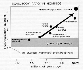 Still, I have a hard time imagining that there have been dozens of such replacement events during the gradual quadrupling of hominid brain size during the last 2.5 million years -- particularly when there is such a simple alternative available, where ice age fluctuations merely pump the periphery and spread around the newly shaped-up subtype. Modern-type Homo sapiens (the model year that probably came in with the previous interglacial about 120,000 years ago) could be the exception to the rule, however -- big game hunting and food preparation technologies might have facilitated a fairly complete takeover, for once, during the last of the two dozen ice ages.