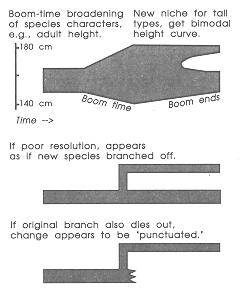 This sort of scenario (and it is hardly restricted to the robust-to-gracile spread of characters) illustrates how a species might split into a Y. If the original species dies out simultaneously, the new would seem to replace the old. "Windows of climatic opportunity" can be quite rapid on the geologist's time scale, and so such boom-time splits might seem sudden. The "tempo and mode" of evolutionary change is especially important, as Darwin recognized: