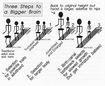 BIG HEADS, RELATIVE TO BODY SIZE, are most readily achieved by exactly the same process used by those salamanders at Mount Rainier: early puberty. We know that brain size, as such, isn't the determinant of cleverness, since elephants and dolphins aren't the leaders in that department. Furthermore, among modern humans a large brain is no sign of genius; despite centuries of looking for a correlation, geniuses keep coming in a variety of head sizes.